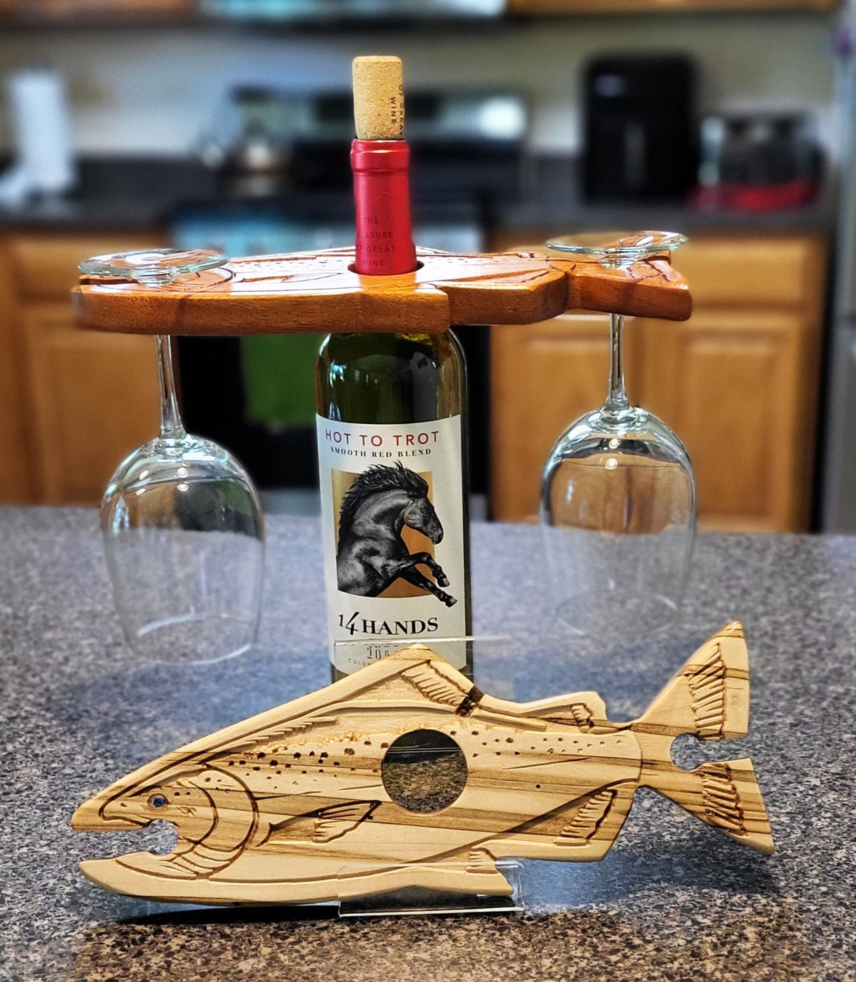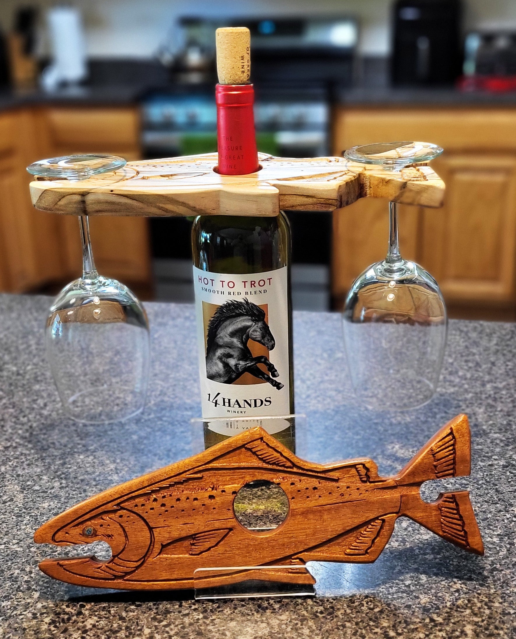 Showcase your favorite wine in style with the Fish Wine Caddy, crafted from durable Acacia and Cherry woods. Its elegant fish-shaped design combines functionality with natural beauty, ensuring your bottle, and wine glasses are held securely while adding a distinctive touch to any table or bar. Perfect for entertaining or gifting, this caddy turns wine serving into a memorable experience.